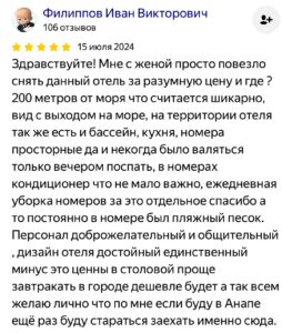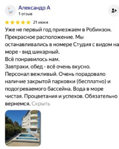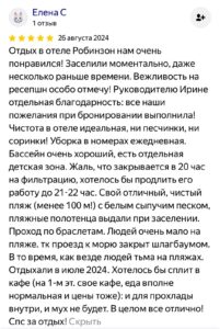 Мы очень благодарны за то, что вы выбрали наш отель для проведения вашего отпуска. Мы всегда стараемся предоставлять лучший сервис для наших гостей и были бы очень признательны за оставленный отзыв о пребывании в отеле «Робинзон», перейдите по ссылке