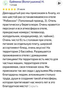 Мы очень благодарны за то, что вы выбрали наш отель для проведения вашего отпуска. Мы всегда стараемся предоставлять лучший сервис для наших гостей и были бы очень признательны за оставленный отзыв о пребывании в отеле «Робинзон», перейдите по ссылке